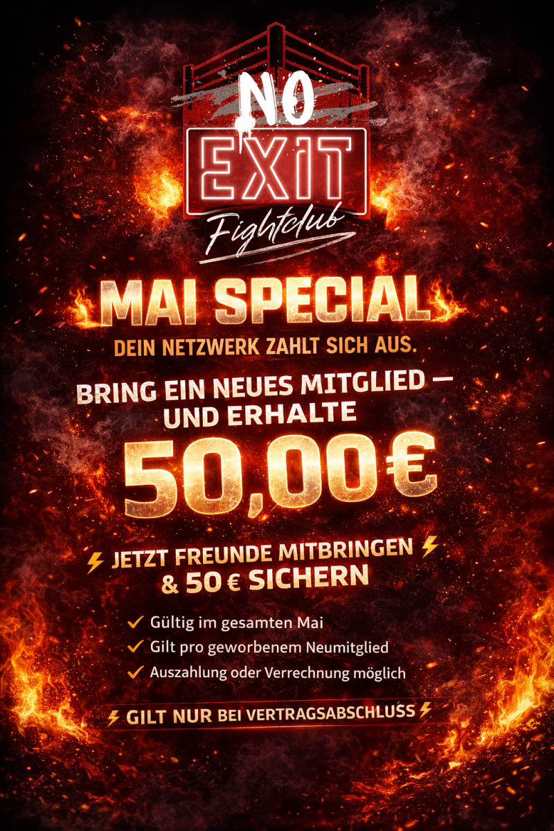 Der Name NO EXIT ist kein Werbeslogan, sondern eine Einstellung. Wer diesen Weg beginnt, entscheidet sich bewusst für Konsequenz. Für Training ohne Ausreden, ohne Abkürzungen und ohne Ego. Fortschritt entsteht bei uns durch harte, aber faire Arbeit, durch gegenseitigen Respekt und durch die Bereitschaft, Verantwortung für die eigene Entwicklung zu übernehmen.