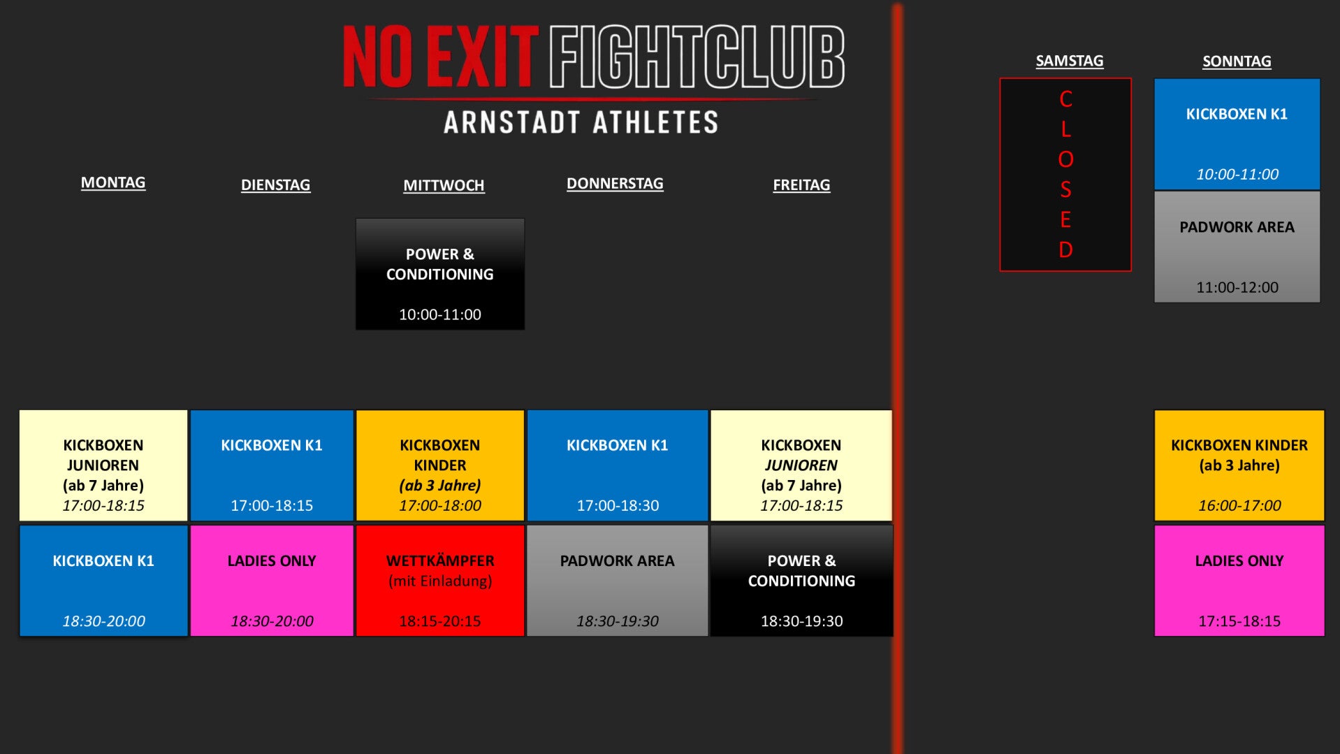 Bei No Exit wird an 7 Tagen pro Woche trainiert. Nicht aus Pflicht, sondern aus Anspruch. Wer Fortschritt sucht, braucht Verfügbarkeit, Struktur und Konsequenz – genau dafür steht unser Trainingsplan.